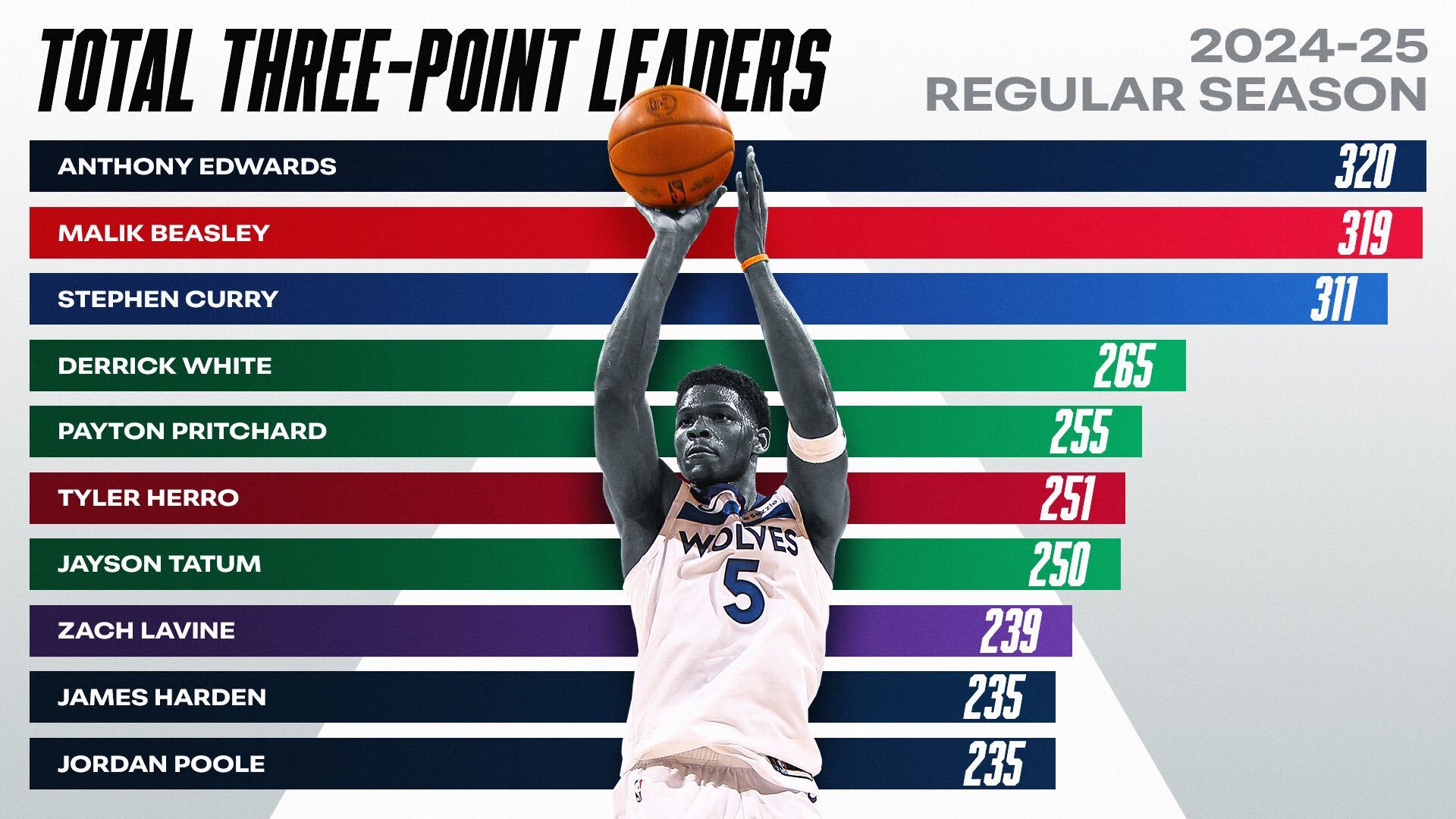 Anthony Edwards : 320 Malik Beasley : 319 Stephen Curry : 311 Derrick White : 265 Payton Pritchard : 255