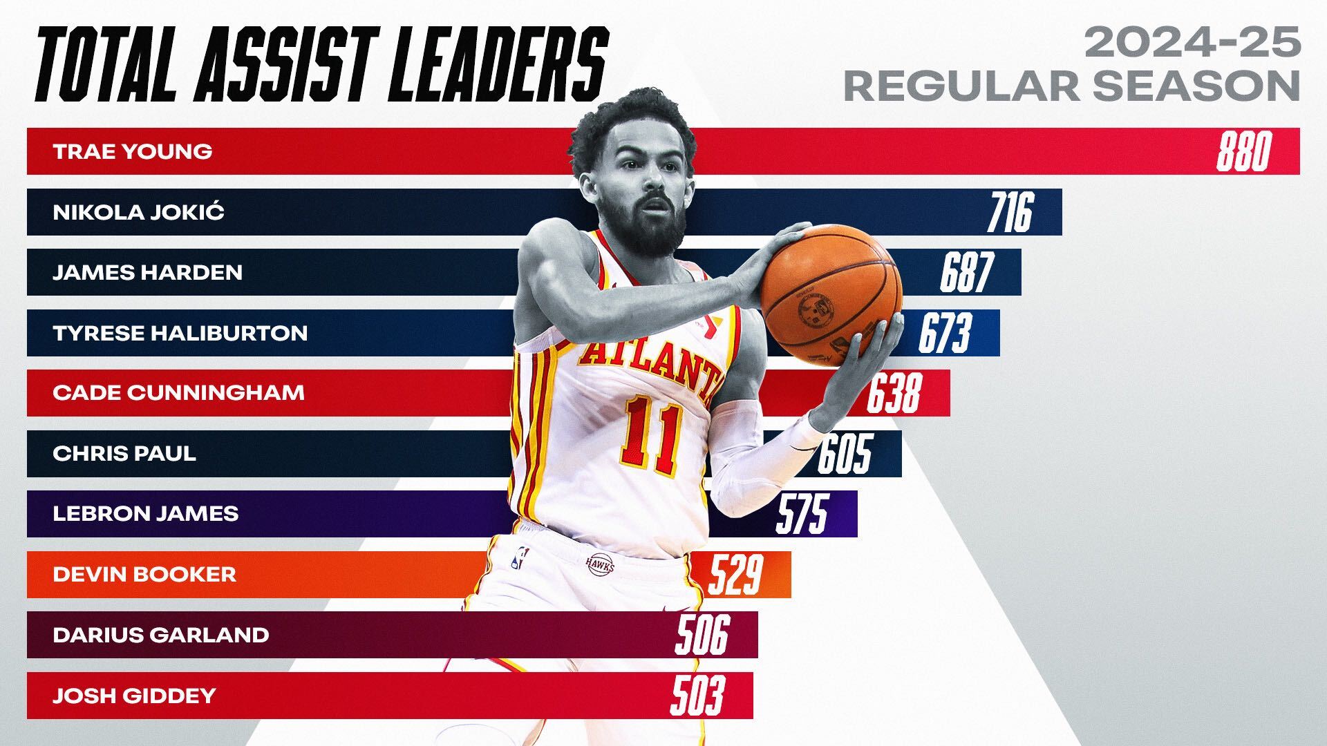 Trae Young : 880 Nikola Jokić : 716 James Harden : 687 Tyrese Haliburton : 673 Cade Cunningham : 638