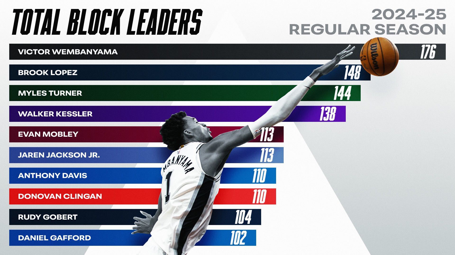 Victor Wembanyama : 176 Brook Lopez : 148 Myles Turner : 144 Walker Kessler : 138 Evan Mobley : 113 Jaren Jackson Jr. : 113