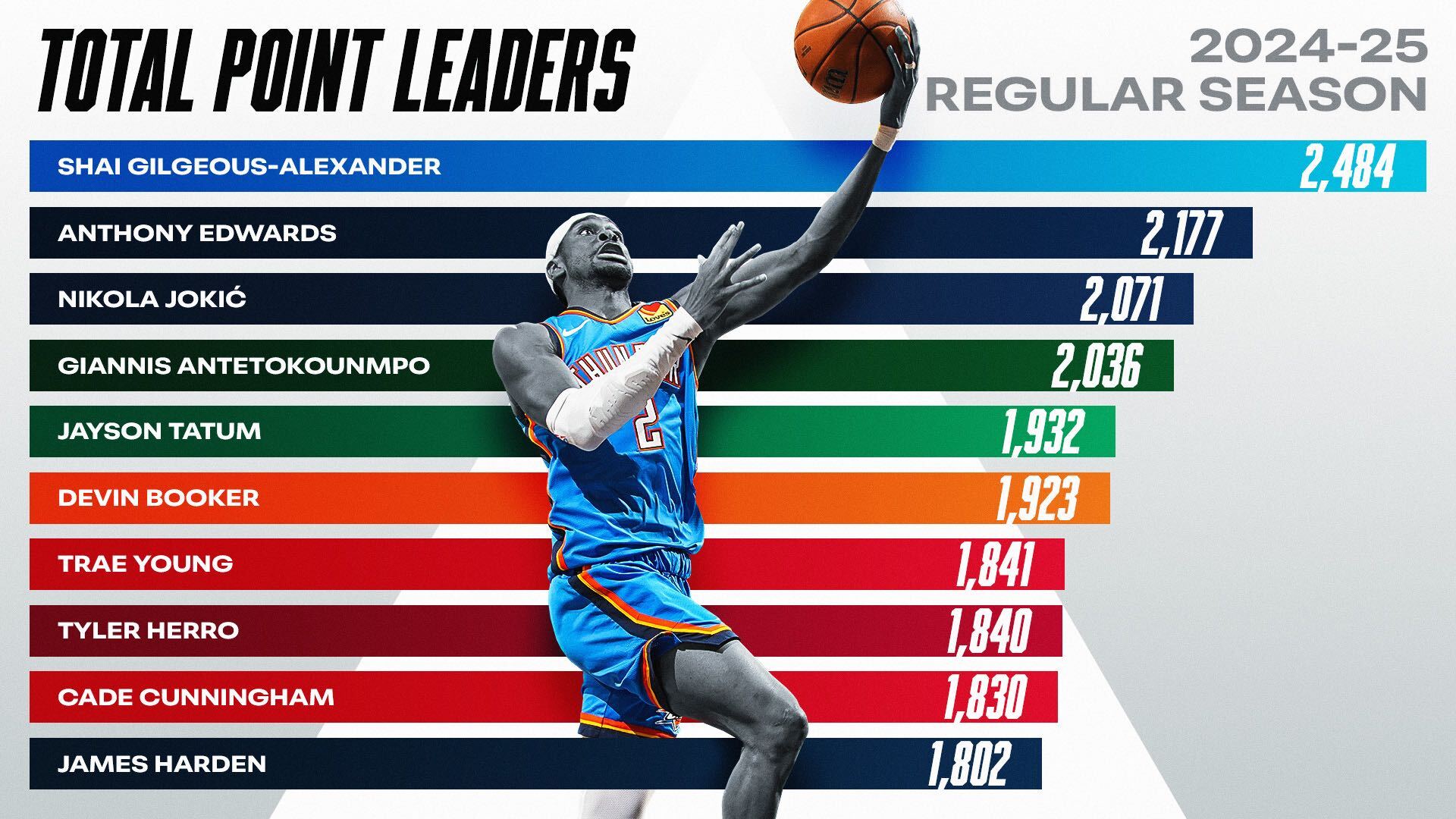 Shai Gilgeous-Alexander : 2,484 Anthony Edwards : 2,177 Nikola Jokić : 2,071 Giannis Antetokounmpo : 2,036 Jayson Tatum : 1,932