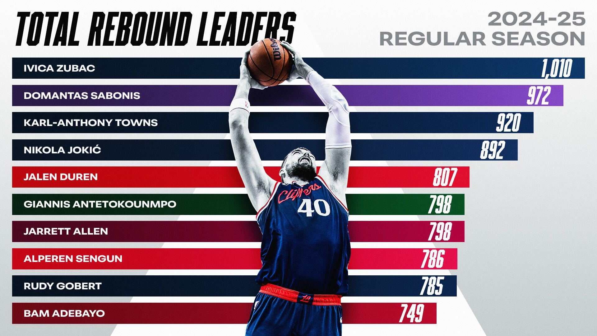 Ivica Zubac : 1,010 Domantas Sabonis : 972 Karl-Anthony Towns : 920 Nikola Jokić : 892 Jalen Duren : 807
