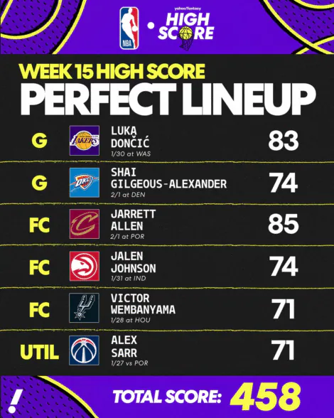 루카 돈치치: 4주 연속 1위를 차지한 루카와는 한 단계 차이가 났습니다. 대신 그는 2점 부족했지만 12월 18일 이후 자신의 가장 높은 판타지 점수를 관리했습니다. NHL의 전설 알렉스 오베치킨이 참석한 가운데 돈치치는 금요일 DC에서 열린 위저즈와의 경기에서 11리바운드, 13어시스트, 3도루로 37득점 트리플더블을 떨어뜨렸습니다. Luka는 16주차에 Nets, 76ers 및 Warriors를 상대하는 Lakers와 함께 이 라인업을 만들 수 있는 또 다른 기회를 가져야 합니다.