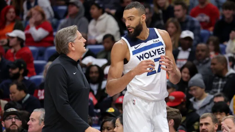 루디 고베어가 경기 도중 미네소타의 크리스 핀치 감독과 이야기를 나누고 있습니다.